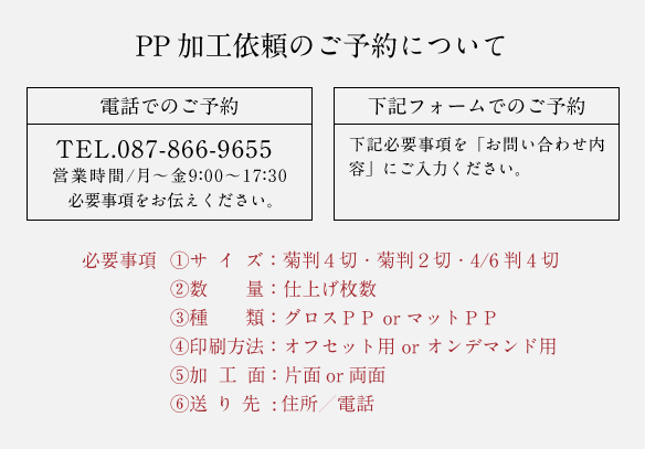 pp加工の必要事項 ①サ イ ズ :菊判4切・菊判2切・4/6判4切 ②数 量:仕上げ枚数 ③種 類:グロスPP orマットPP ④印刷方法:オフセット用 or オンデマンド用 ⑤加 工 面:片面or両面 ⑥送り先:住所/電話